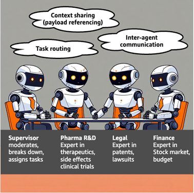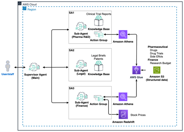 เรามาดูตัวอย่างจริงจากเคสของ AWS “Build an intelligent multi-agent business expert using Amazon Bedrock” กันดีกว่าครับ ในบทความนี้เราจะเห็นได้ว่า Amazon Bedrock Agents สามารถสร้างระบบ AI หลายตัว (multi-agent system) มาทำงานร่วมกันได้แบบฉลาดมาก ๆ โดยบทความเค้ายกเคสบริษัทยาแห่งหนึ่ง ที่ต้องจัดการข้อมูลขนาดใหญ่จากหลายแผนก ทั้ง R&D, กฎหมาย และการเงิน ข้อมูลเหล่านี้กระจายอยู่ในหลายระบบ เช่น ฐานข้อมูลทางการทดลองยา, รายงานสิทธิบัตร, และข้อมูลราคาหุ้น ทำให้การวิเคราะห์เชื่อมโยงข้ามหน่วยงานเป็นเรื่องยากและใช้เวลานาน